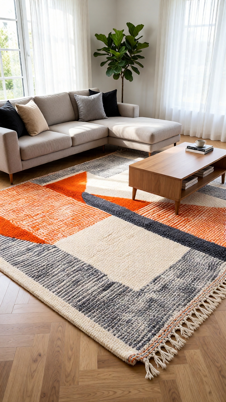 A bold geometric rug featuring warm orange, soft ivory, and muted blue tones. Its plush texture and subtle fringe add comfort and modern character to any space.