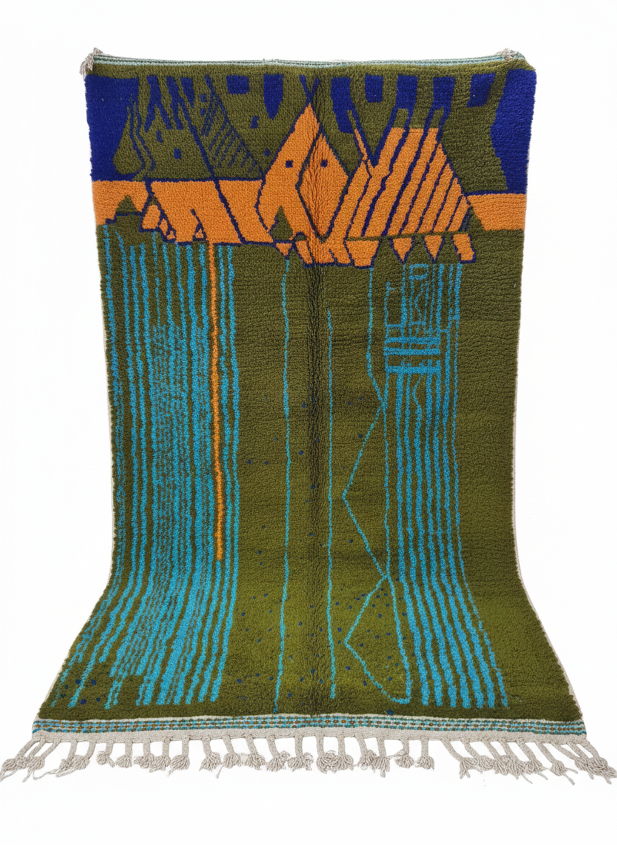+ Free ShippingA bold, expressive textile piece that functions as both a rug and a tapestry. Dominated by a deep moss green field, the design features striking architectural shapes in burnt orange and electric blue that mimic a stylized mountain range or skyline.